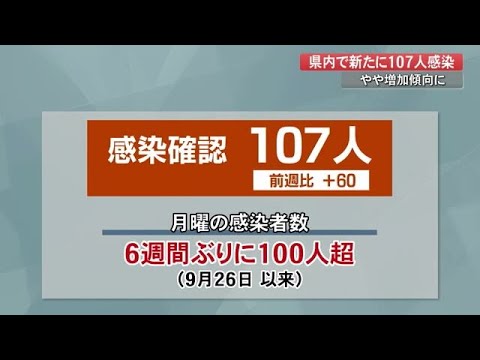 感染が判明したのは未就学児から90歳以上までの107人です。亡くなった人はいません。前の週の同じ曜日と比べ60人増えていて、月曜の感染者数としては9月26日以来6週間ぶりに100人を超えました。