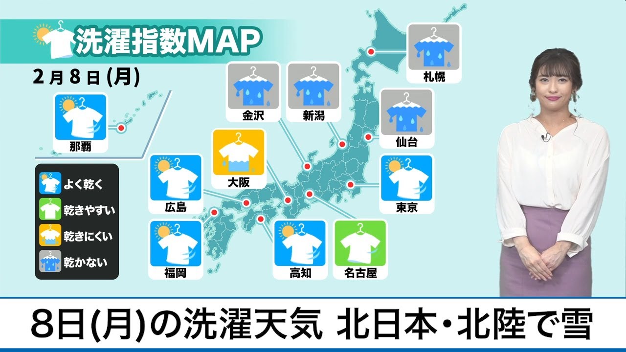 2月8日(月)は冬型の気圧配置となり、日本海側を中心に雪となります。太平洋側では晴れて洗濯物が乾く天気となります。