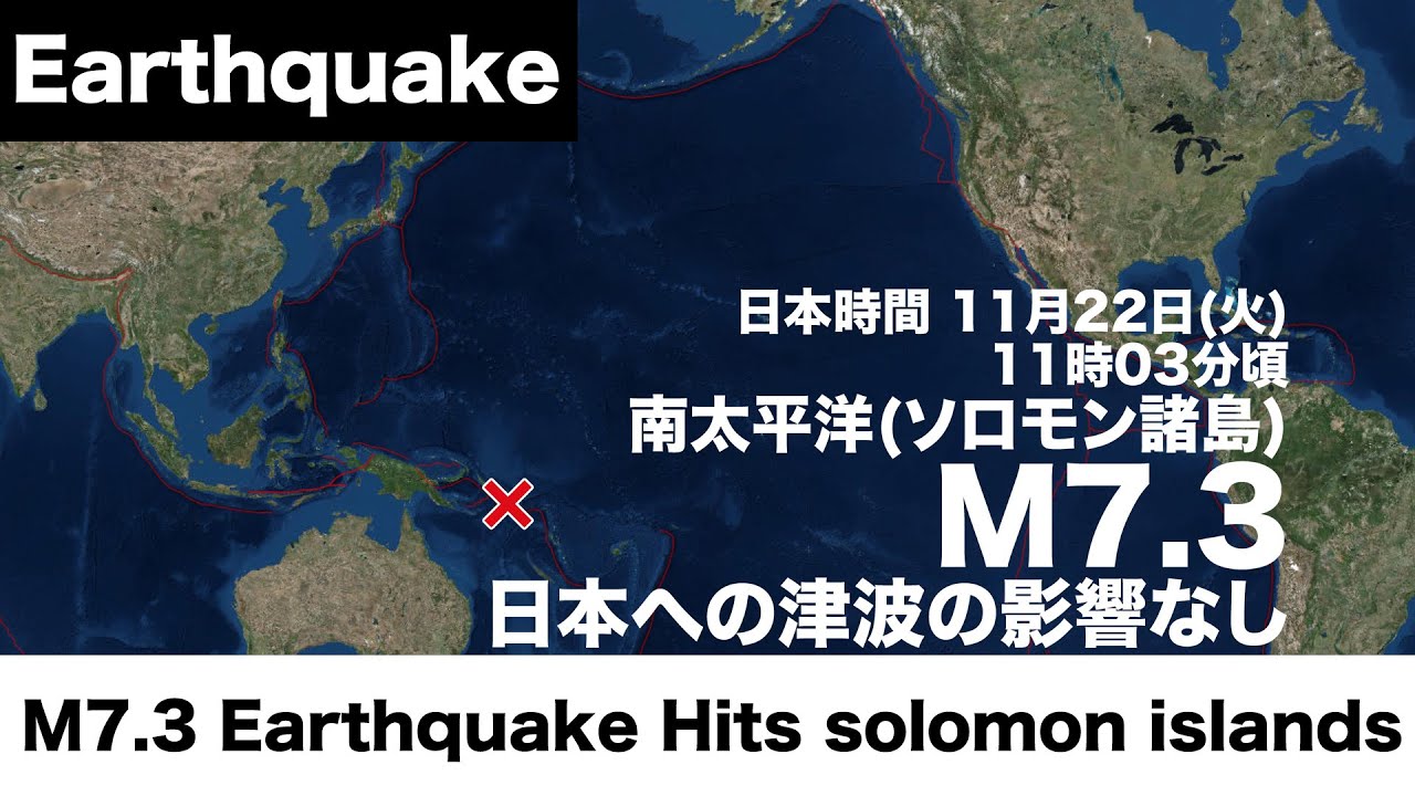 日本時間の11月22日(火)11時03分頃、海外で規模の大きな地震がありました。震源地は南太平洋(ソロモン諸島)で、地震の規模(マグニチュード)は7.3と推定されます。