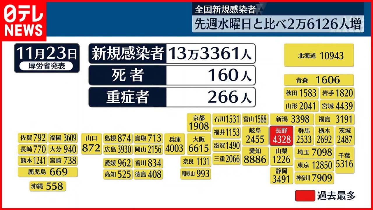 厚生労働省によりますと、23日午前0時までに報告された全国の新たな感染者は13万3361人で、先週の水曜日(16日)と比べて、2万6126人増えました。新たに亡くなったのは160人、重症者は266人と前日より3人増えています。