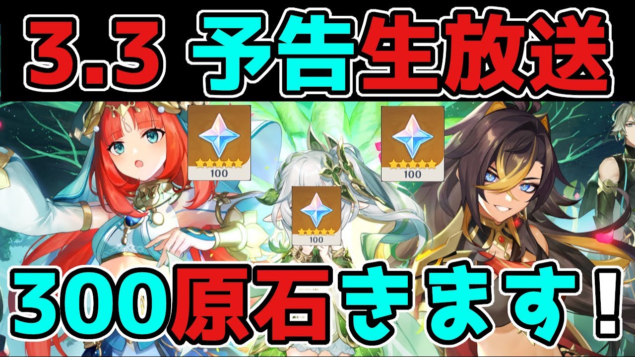 原神げんしん最新バージョンVer3.2のスメールにて、3.3の予告生放送の日時が公式から緊急速報!。リーク無し。旅人の皆さんにガチャでナヒーダ,スカラマシュ,宵宮,八重,タルタリヤ,ファルザン。セノ,ニィロウ,ティナリ,鍾離(しょうり)甘雨(かんう)万葉(カズハ)夜蘭(イェラン)神里綾華(かみさとあやか)神里綾人ウェンティ雷電将軍と珊瑚宮心海(サンゴノミヤココミ)申鶴(しんかく)魈(しょう)荒瀧一斗(あらたきいっと),アルベド,エウルア,胡桃(フータオ)とが出ますように。他の動画などでは世界任務アチーブメント豪華な宝箱原石モラ育成素材天賦突破素材貴重な宝箱冒険経験値聖遺物稲妻評判経験値などの入手方法などもご紹介しています。このチャンネルではリーク画像や情報を扱っていません。考察情報なども公式情報を元に楽しむ内容となっています。