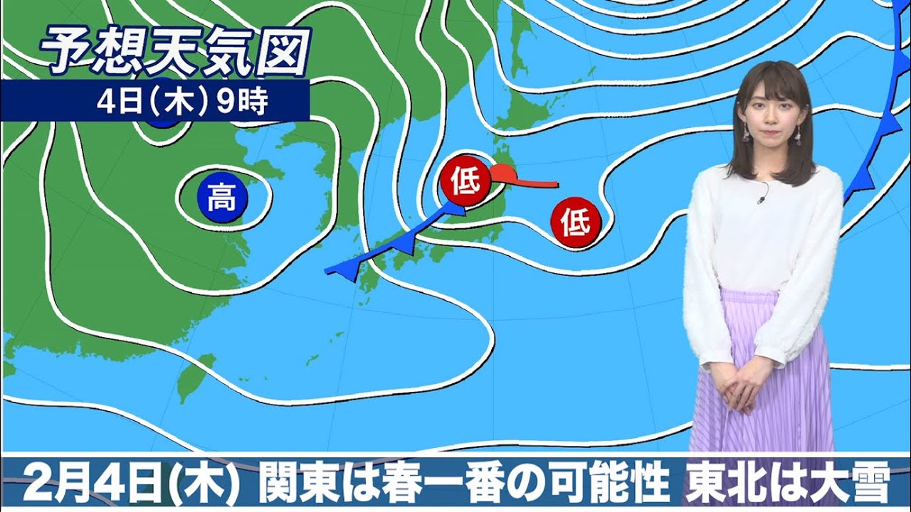 4日(木)は低気圧が日本海から東北地方に進む見込みです。 低気圧に近い東北は大雪に警戒が必要です。低気圧に向かって吹き込む風が強まって、東京など関東では春一番になる可能性があります。大雪ピンポイント天気 最新情報をLiVEで解説中 2021Casterウェザーニュースキャスターゲリラ豪雨ゲリラ雷雨ニュース乾燥予報停電北日本台風台風情報地震大雨大雪天気天気予報天気痛情報暴風東日本気象気象予報士洗濯減災西日本防災
