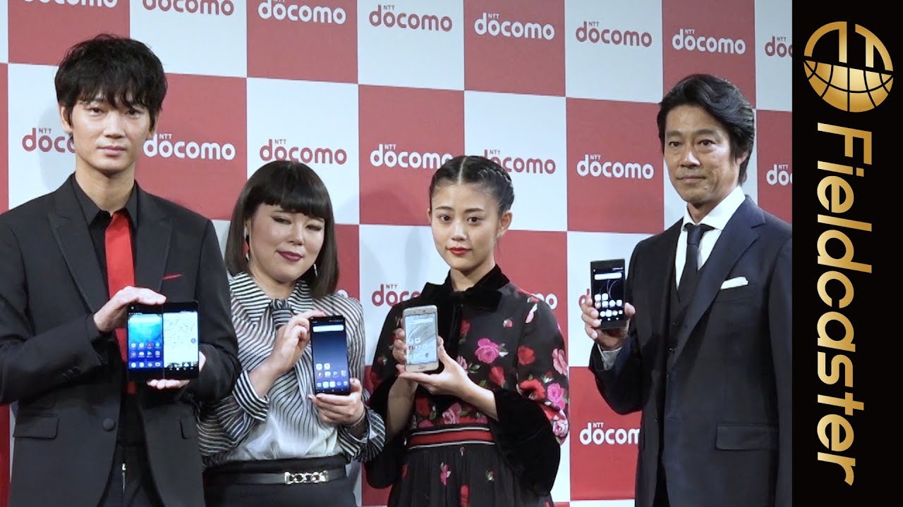 NTTドコモ『2017-2018 冬春 新サービス・新商品』の発表会に俳優の堤真一さん、綾野剛さん、高畑充希さん、お笑い芸人のブルゾンちえみさんが登場しました。
