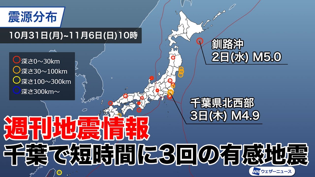 関東の陸域の地震がやや目立ち、西日本の陸域でも有感地震が散発的に起きています。震度3以上の地震は4回発生しました。