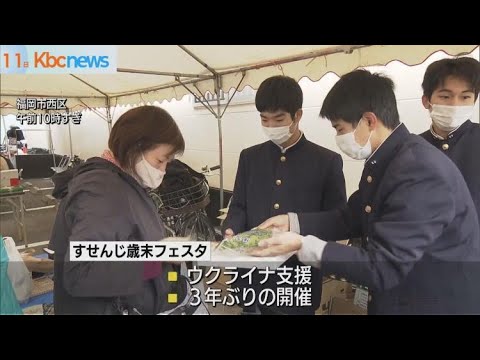 福岡市西区の周船寺でウクライナを支援しようと地元の高校も参加して「歳末フェスタ」が11日開かれました。福岡に住む、ウクライナ人倉冨アンナさんの澄んだ歌声で始まった「すせんじ歳末フェスタ」。3年ぶりに開かれた今年の目的は、「ウクライナ支援」です。 制服姿で玄洋高校の生徒も参加し「募金のお金で生活が今まで通りに戻ればいいなと思います」と募金を募りました。つきたてのお餅や手づくり味噌をはじめ、JAや商工連合会自慢の品々の販売には、たくさんの人が集まり、にぎわっていました。 KBCウクライナニュース九州朝日放送佐賀福岡