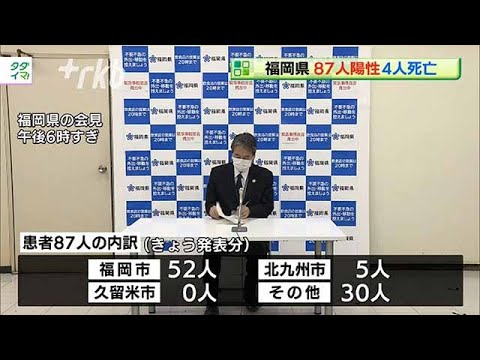 新型コロナウイルスについてお伝えします。福岡県は12日、新たに87人の陽性と4人の死亡を発表しました。