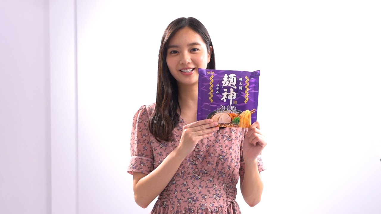 今回のCMでは、CMキャラクターの新川優愛さんが、動画再生累計3億回超えの話題曲「ポケットからきゅんです!」を替え歌にし、「袋から麺です」「あ、麺神の太麺です」「店並みの食感です」「でも君が買わないならシュンです」と商品の特徴を切なく歌い上げる内容となっています。
