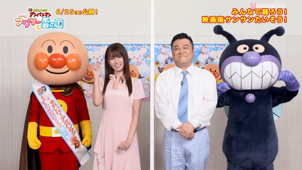 今回解禁となった映像では、作品にとっておなじみの<サンサンたいそう>を“雲の長老”の声を演じるアンタッチャブル山崎が、アンパンマンやばいきんまんらキャラクターたちと一緒に踊っている様子を収録。また本作で“フワリー”の声を演じる深田は、この動画を見ている子どもたちが踊りやすいように、優しいアドバイス&応援ナレーションで参加している。
