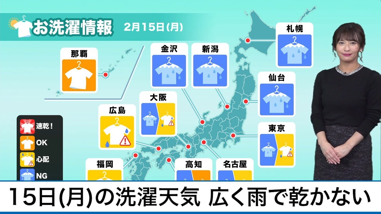 広範囲で雨となるため洗濯を外干しするには適さない天気となりそうです。