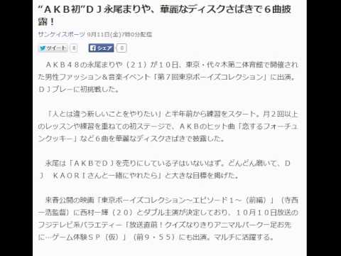 AKB48の永尾まりや(21)が10日、東京・代々木第二体育館で開催された男性ファッション&音楽イベント「第7回東京ボーイズコレクション」に出演。DJプレーに初挑戦した。