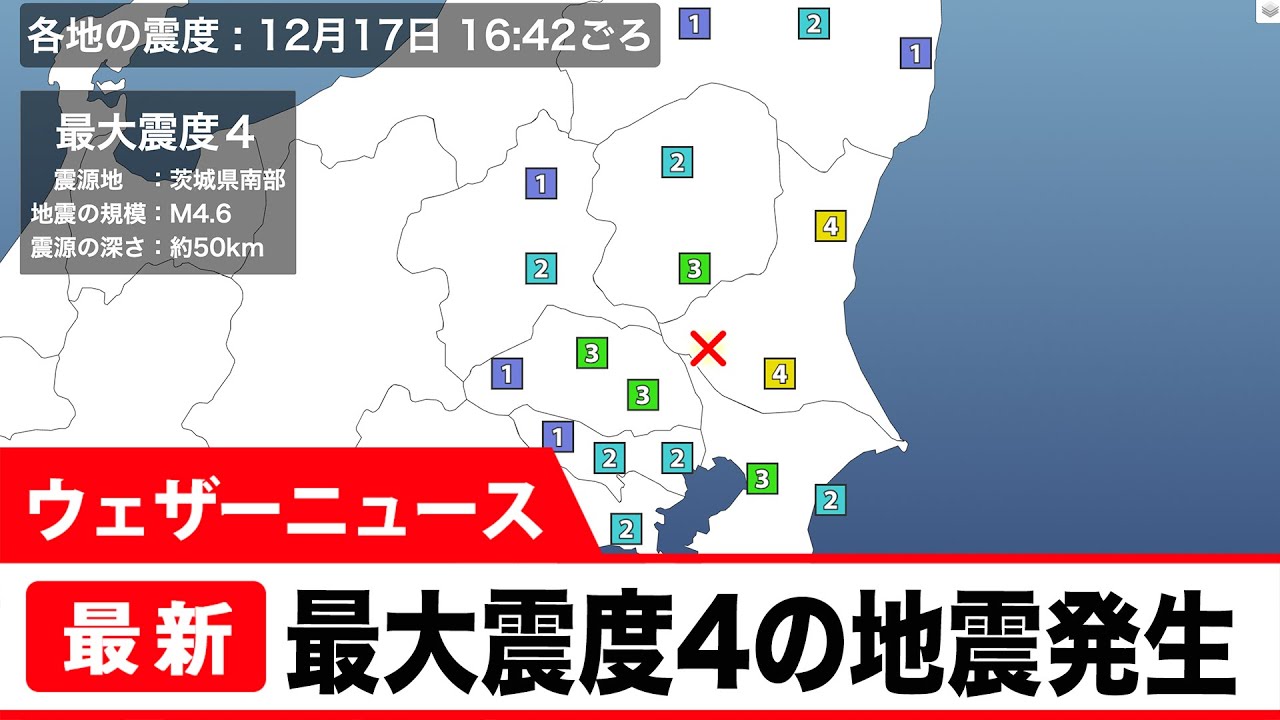 12月17日 16:42 茨城県南部を震源とする最大震度4の地震が発生しました▼最新の地震情報・気象情報をLiVEで配信中▼ウェザーニュース地震情報 2020Casterウェザーニュースキャスターゲリラ豪雨ゲリラ雷雨ニュース予報北日本台風台風情報地震地震情報大雨天気天気予報情報東日本気象気象予報士減災西日本防災