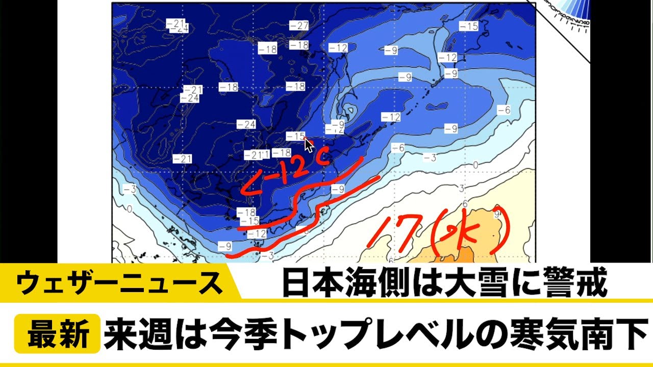 週明けに爆弾低気圧が通過した後、日本列島の上空には今季トップレベルの強い寒気が南下します。冬型の気圧配置が強まり、日本海側は大雪に警戒が必要です。