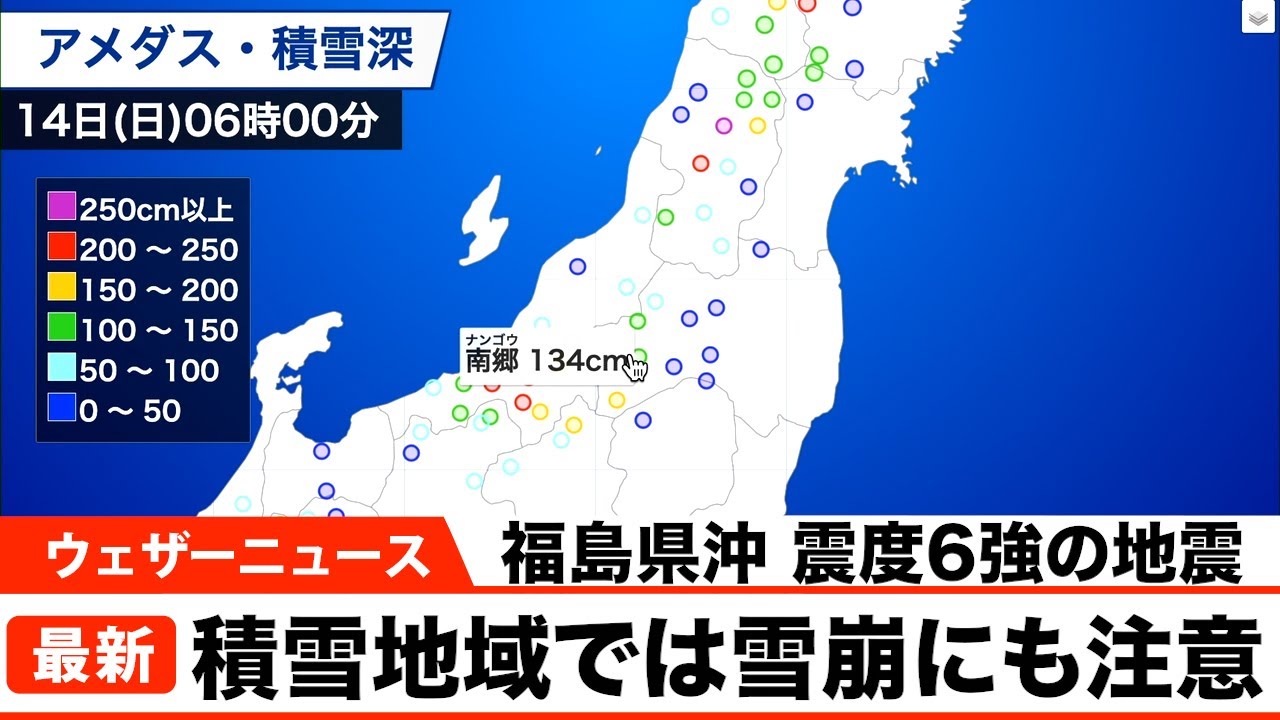 13日(土)の夜に福島県沖を震源とするマグニチュード7.3の地震が発生し、最大震度6強を観測。東北から近畿、中国にかけての広い範囲で揺れを感じました。雪の多い地域でも強い揺れに見舞われており、雪崩の発生に注意が必要です。 地震の情報はこちらから→ 2021Casterウェザーニュースキャスターゲリラ豪雨ゲリラ雷雨ニュース乾燥予報停電北日本台風台風情報地震大雨大雪天気天気予報天気痛情報暴風東日本気象気象予報士洗濯減災西日本防災震源情報