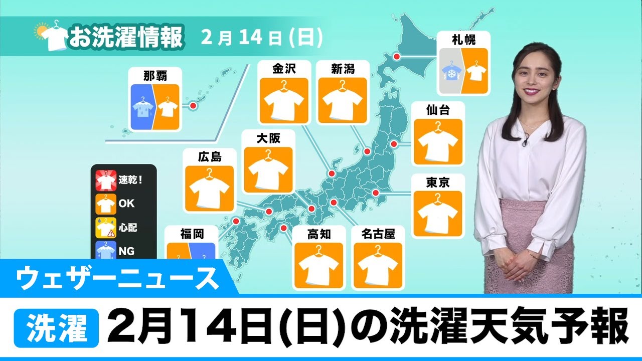 今日、2月14日(日)の洗濯天気予報をお伝えします。 今日は全国的に外干しOKとなっています。 ただ一部のエリアで雨や雪が降る可能性がありますので、空の変化にご注意ください。 お洗濯情報はこちらから→ 2021Casterウェザーニュースキャスターゲリラ豪雨ゲリラ雷雨ニュース乾燥予報停電北日本台風台風情報地震大雨大雪天気天気予報天気痛情報暴風東日本気象気象予報士洗濯減災西日本防災
