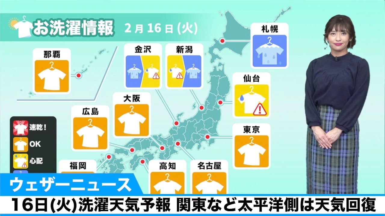 16日(火)は台風並みに発達した低気圧がオホーツク海に進み、北日本で冬型の気圧配置が強まります。大雪や吹雪に警戒が必要です。一方、関東以西は太平洋側を中心に天気が回復して晴れる所が多くなります。しっかりと日差しが届いて、昼間の気温は15℃前後まで上がる予想です。洗濯の外干しも出来そうですが、強い風にはご注意ください。 2021Casterウェザーニュースキャスターゲリラ豪雨ゲリラ雷雨ニュース乾燥予報停電北日本台風台風情報地震大雨大雪天気天気予報天気痛情報暴風東日本気象気象予報士洗濯減災西日本防災
