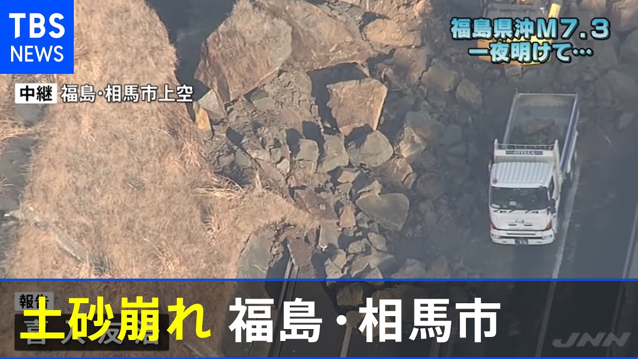 震度6強を観測した福島県相馬市の常磐自動車道です。13日夜の地震から一夜明けましたが、土砂崩れが起きた現場は現在も通行止めが続いています。崩れた法面の高さはおよそ10メートル、横幅はおよそ50メートル、今も土砂を撤去する作業が続いています。巻き込まれた車はいないということです。
