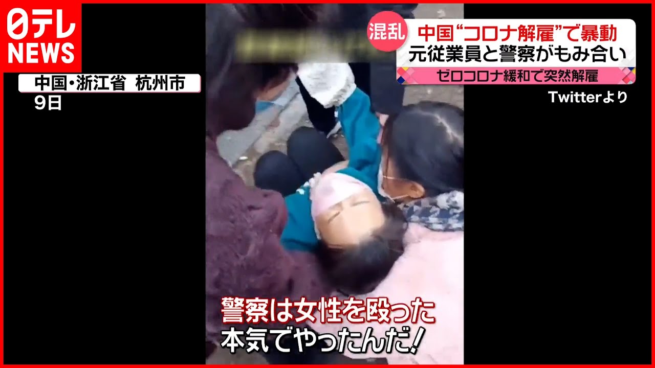 こうした仕事を失った人は各地で相次いでいて、暴動も起きています。中国・浙江省の杭州市では、抗原検査キットなどを製造していた会社の従業員が突然解雇され、抗議デモを起こしていました。
