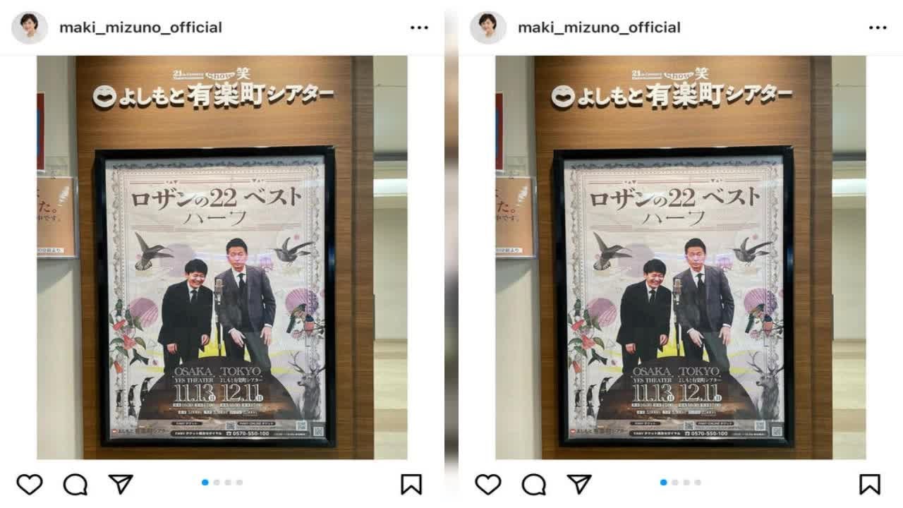 水野は「長きに渡り『魔法のレストラン』でお世話になっている、大好きなロザンのお二人。8年ぶりとなる単独ライブ『ロザンの22ベスト ハーフ』開催とのことで観て参りました」と、会場でのポスターをアップ。「8年ぶりといわず、毎年開催してほしい 単独LIVEというモノに初参戦。一時間というのも丁度良い長さで クセになりそうで!!」と満足した様子だった。
