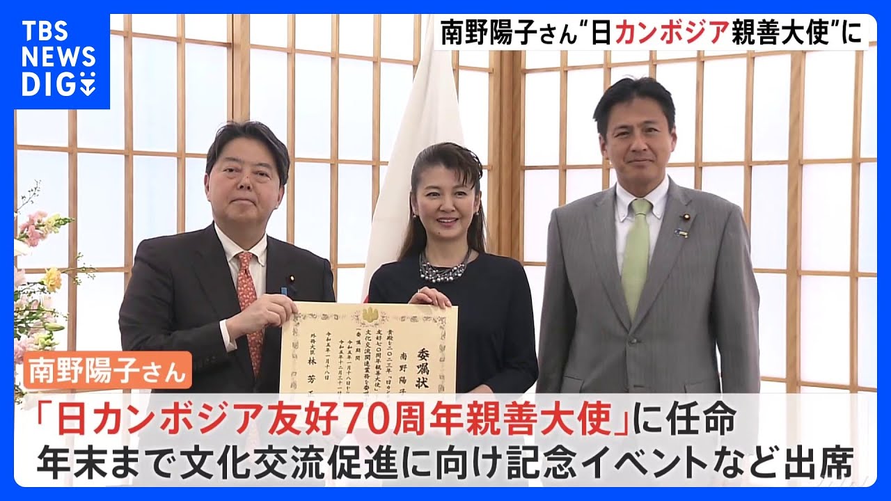 歌手で俳優の南野陽子さんが「日カンボジア友好70周年親善大使」に任命され、きょう外務省で委嘱状を受け取りました。