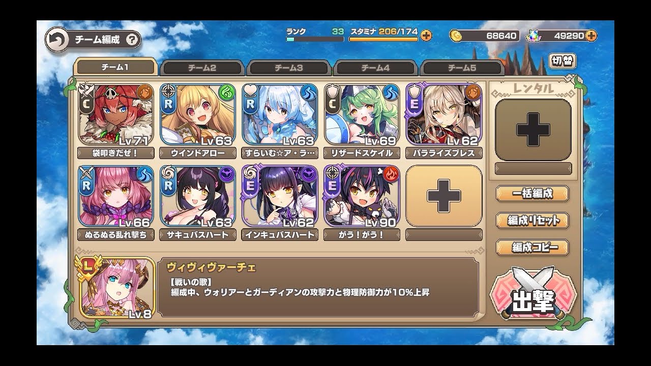 gdgdですが参考までにどうぞ~ ※カッツォLv4がまだ突破出来ていませんが、こちらの方が楽でしたね 旗を即撃破するためのヴィヴィヴァーチェが必要です! ボスに攻撃するキャラに攻撃力強化や攻撃待機時間短縮などで火力を上げれば問題ないと思います サウラにアイアンボディとリジェネレーションを付けていたのですがオートパニッシャーの方がいいかな? サウラ家の人々千年戦争アイギス