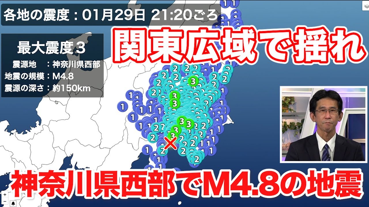 1月29日(日)21時20分頃、関東地方で最大震度3を観測する地震がありました。