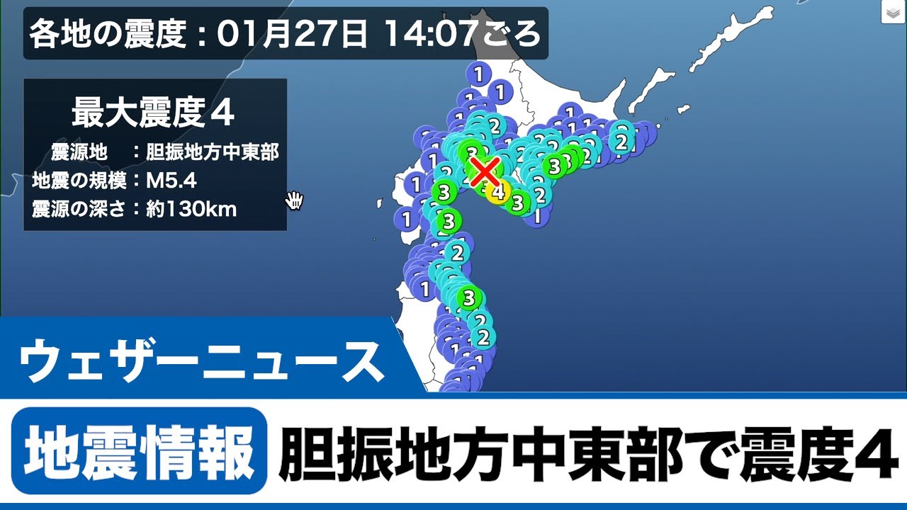 1月27日(水) 14時7分頃、北海道の道南で最大震度4を観測する地震がありました。この地震について、ウェザーニュース予報センターより解説します。 なお、この地震による津波の心配はありません。震源地:胆振地方中東部 マグニチュード:5.4 震源の深さ:約130km最新気象情報 2020Casterウェザーニュースキャスターゲリラ豪雨ゲリラ雷雨ニュース予報北日本北海道台風台風情報地震大雨天気天気予報情報東日本気象気象予報士減災胆振地方西日本防災震源情報