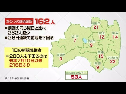 感染が確認されたのはいわき市で22人、福島市で21人、県中保健所管内で15人など、あわせて162人です。