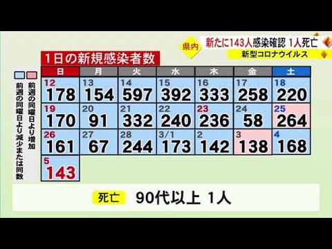 続いて新型コロナウイルス、熊本県内では5日、新たに143人の感染が確認されました。1日の新規感染者数は、先週の日曜日と比べて18人減少しています。 また、90代以上の1人の死亡が発表されました。 143人1人感染新型コロナウイルスで死亡熊本県内