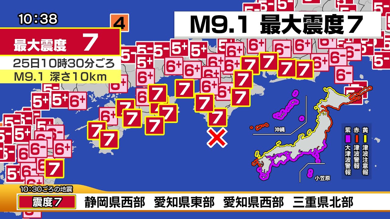 2XXX年、南海トラフ巨大地震発生。マグニチュードは9.1、国内観測史上最大クラスの巨大地震。東海地方から九州地方にかけて震度7の激しい揺れを観測、大きな揺れが3分以上続き、名古屋や大阪では長周期地震動が発生。高層ビルは10分以上揺れ続ける。東京でも東日本大震災を上回る揺れが続く。なかなか揺れが収まらない中、地震発生からわずか2分で和歌山県と静岡県に津波が到達、高さはすぐに10mに達する。大津波が到達する中、大規模な余震も繰り返し発生し被害を拡大させる。