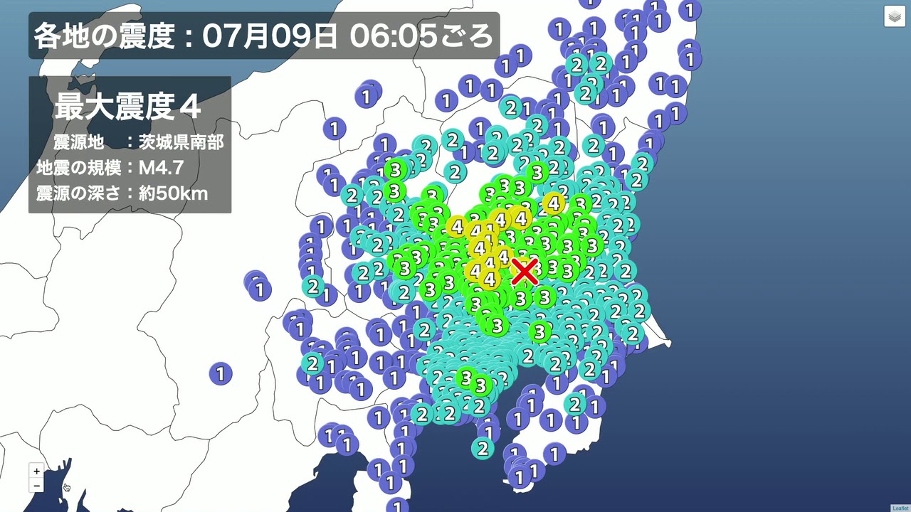 Share Facebook Twitter Pinterest LinkedIn 【地震速報】7月9日 6:05 関東で最大震度4の地震が発生 震源:茨城県南部 M4.7 深さ約50km この地震による津波の心配はありません。 緊急地震速報で最大震度5弱の情報が入りましたが、観測された最大震度は4です。 ▼地震速報をLiVEで視聴 2020Casterウェザーニュースキャスターゲリラ豪雨ゲリラ雷雨ニュース予報北日本台風台風情報地震大雨天気天気予報情報東日本気象気象予報士減災緊急地震速報西日本防災雨震度5弱震源情報