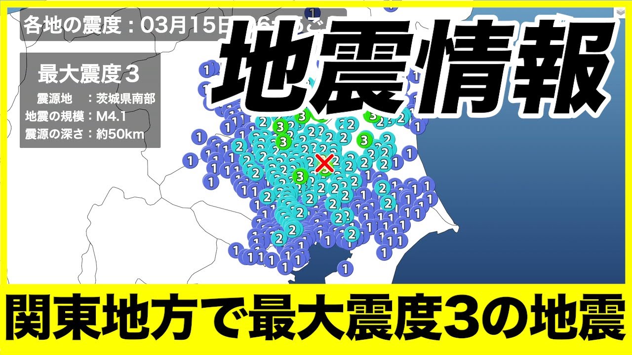 3月15日(水)6時05分頃、埼玉県・群馬県・茨城県・栃木県で最大震度3を観測する地震がありました。この地震による津波の心配はありません。
