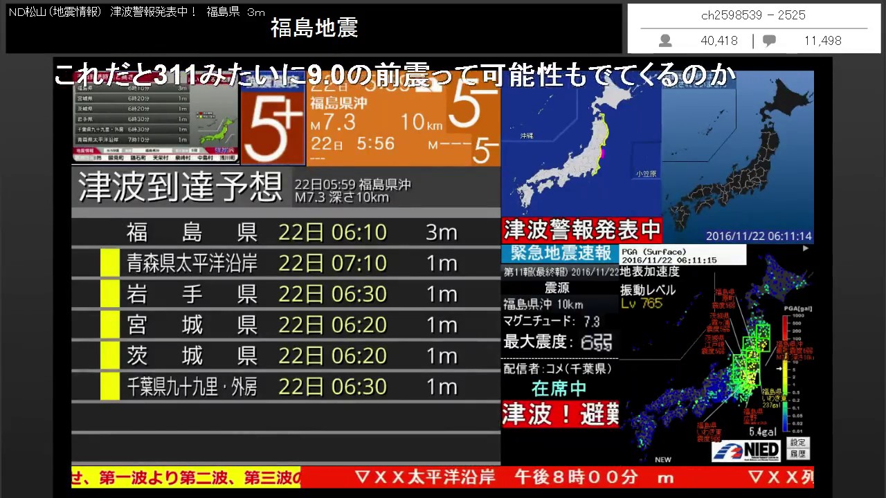 Share Facebook Twitter Pinterest LinkedIn ニコニコチャンネル「BSC24 自然災害情報共有放送局」での地震発生時の生放送TSを、アーカイブとして公開します。 この動画はコメント有り版です。コメント無し版はこちら→ 基本的に5弱以上で公開する予定です。 福島地震