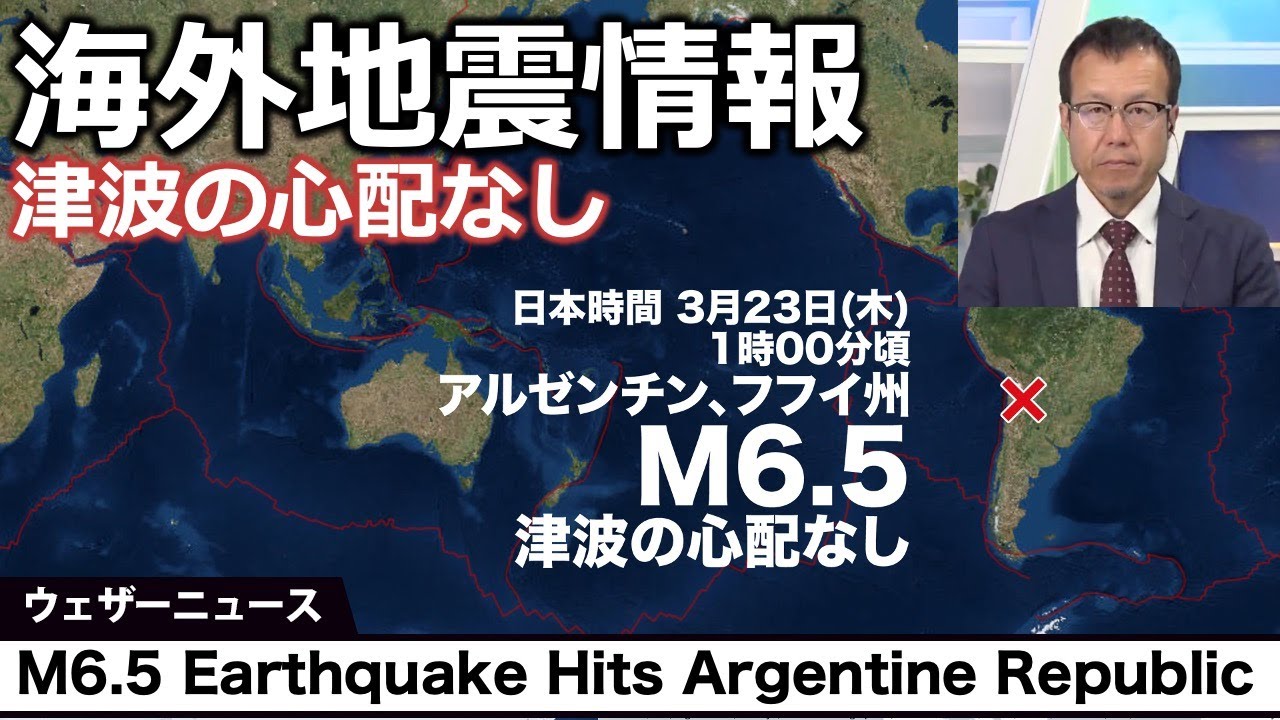 日本時間の3月23日(木)1時00分頃、海外で地震がありました。震源地は南米西部(アルゼンチン、フフイ州)で、震源の深さは約210km、地震の規模(マグニチュード)は6.5と推定されます。この地震による津波の心配はありません。