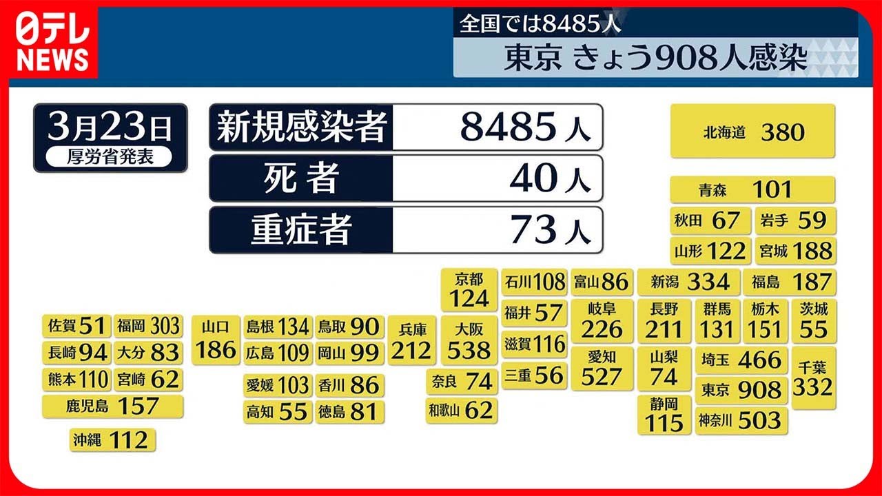 厚生労働省によりますと、23日午前0時までに報告された全国の新たな感染者は8485人で、先週木曜日と比べて758人増えました。また、全国で亡くなった方の報告は40人、重症者は前の日と変わらず73人でした。