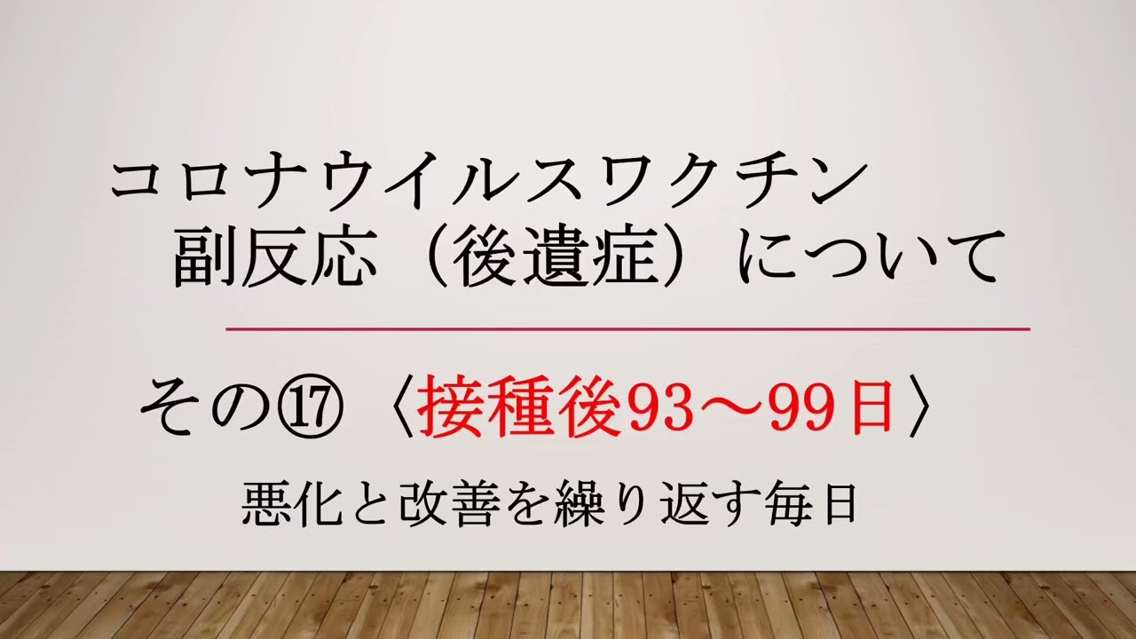 Share Facebook Twitter Pinterest LinkedIn コロナウイルスワクチン(ファイザー)の1回目接種後の副反応と症状の続きです。 93日〜99日までまとめています。 今回は特にイベントはありません。タイトルの通り、症状の悪化と改善を繰り返した内容となっています。 体調が良いときに動画作成をしているため、時間がかかりますが、接種後の経過をお伝えしていきたいと思います。 コロナウイルス症状