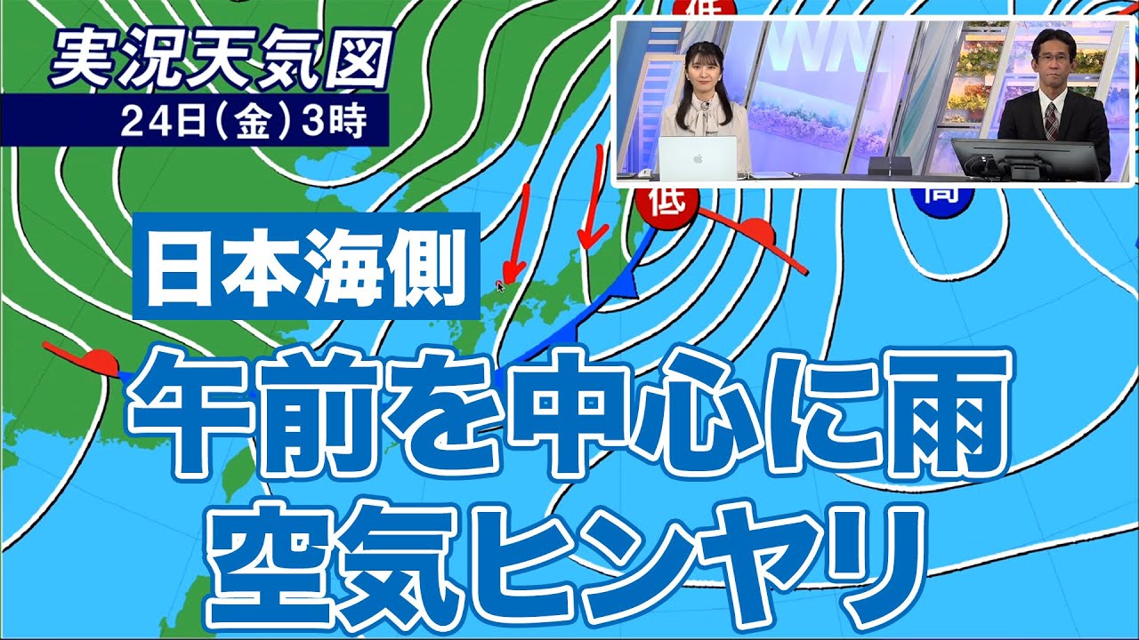 前線は東へ離れつつあるものの、日本付近には雨雲が点在しています。特に北陸や東北の日本海側、山陰などでは昼頃にかけて雨の降りやすい状況が続く見込みです。午後になると雨は落ち着くものの、冷たい風で、気温はあまり上がりません。