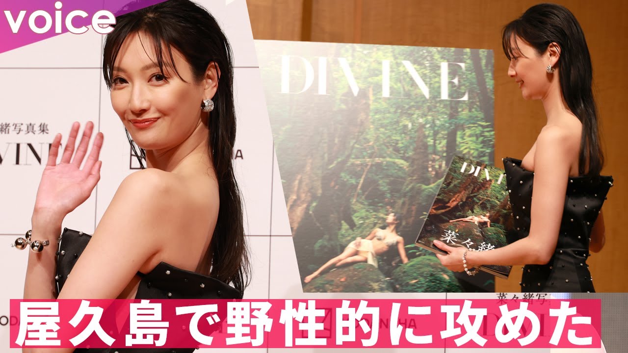 菜々緒が写真集『DIVINE』発売記念記者会見に臨んだ。「菜々緒ポーズ」で話題となった写真集から10年。2冊目となる本作では「前作を超えるパワフルなものになっている」と自信をのぞかせる。撮影は屋久島。大自然のなかでの撮影に臨むため「野性的でいたい」と過度な筋トレはせずに野菜などを中心とした食生活を送った。大胆な露出にも挑戦。美ボディで知られる「菜々緒」の神々しい被写体が多数掲載される。