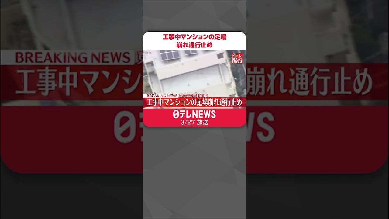 27日未明、東京・武蔵村山市で工事中のマンションの足場が崩れているのが見つかり、警視庁などは付近の道路を通行止めにして撤去作業にあたっています。