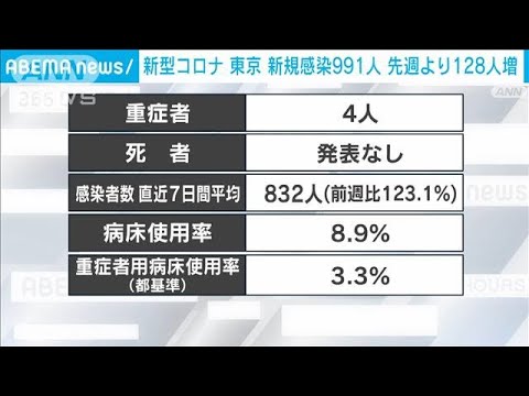 東京都で1日に確認された新型コロナウイルスの新たな感染者は991人でした。先週の土曜日より128人増えました。