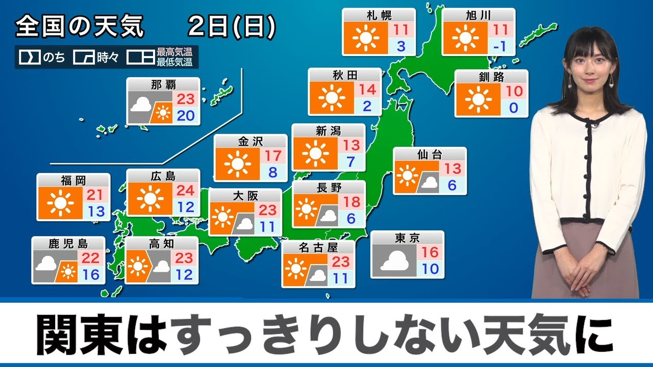 高気圧が北日本付近を覆い、関東から西の太平洋側では高気圧から吹く湿った東風の影響を受けます。日本海側を中心に晴れる所が多くなりますが、関東から九州にかけての太平洋側は雲が広がりやすい見込みです。