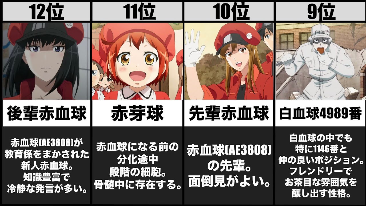 はたらく細胞BLACK はたらく細胞実写 映画はたらく細胞 後輩赤血球 赤芽球 先輩赤血球 白血球 樹状細胞 うしろまえちゃん 赤血球 好酸球 白血球 マクロファージ キラーT細胞班長 血小板ちゃん 音楽:BGMer comicアニメキラーT細胞はたらく細胞はたらく細胞BLACKマクロファージランキング漫画白血球血小板ちゃん赤血球