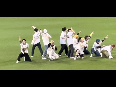 At the traditional Koshien stadium, JO1 performed their new song “Tiger” with a dance routine. Then, two young baseball players, Kazunari Mamehara and Takumi Kawanishi, faced off as pitcher and batter.