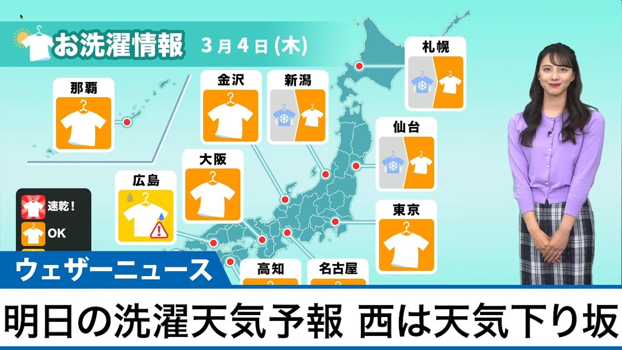 関東から北日本にかけては高気圧に覆われ、晴れる所が多くなります。 西日本は午前中、晴れ間の見える所も次第に雲が厚みを増して、天気が下り坂に向かいます。 太平洋側の早い所では昼頃から雨が降り出し、夕方から夜にかけては九州を中心に雨の範囲が広がります。 2021Casterウェザーニュースキャスターゲリラ豪雨ゲリラ雷雨ニュース乾燥予報停電北日本台風台風情報地震大雨大雪天気天気予報天気痛情報暴風東日本気象気象予報士洗濯減災西日本防災