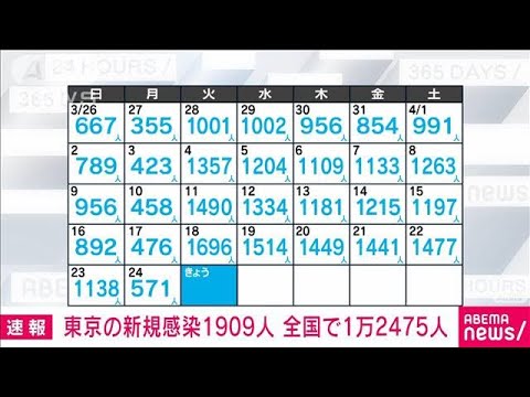 Share Facebook Twitter Pinterest LinkedIn 東京都で25日に確認された新型コロナウイルスの新たな感染者は1909人でした。前の火曜日より213人増えました。 全国の新たな感染者は1万2475人でした。 [テレ朝news] https://news.tv-asahi.co.jp providedコロナ感染者今日テレビ朝日ニュース新型コロナウイルス本編のみ東京