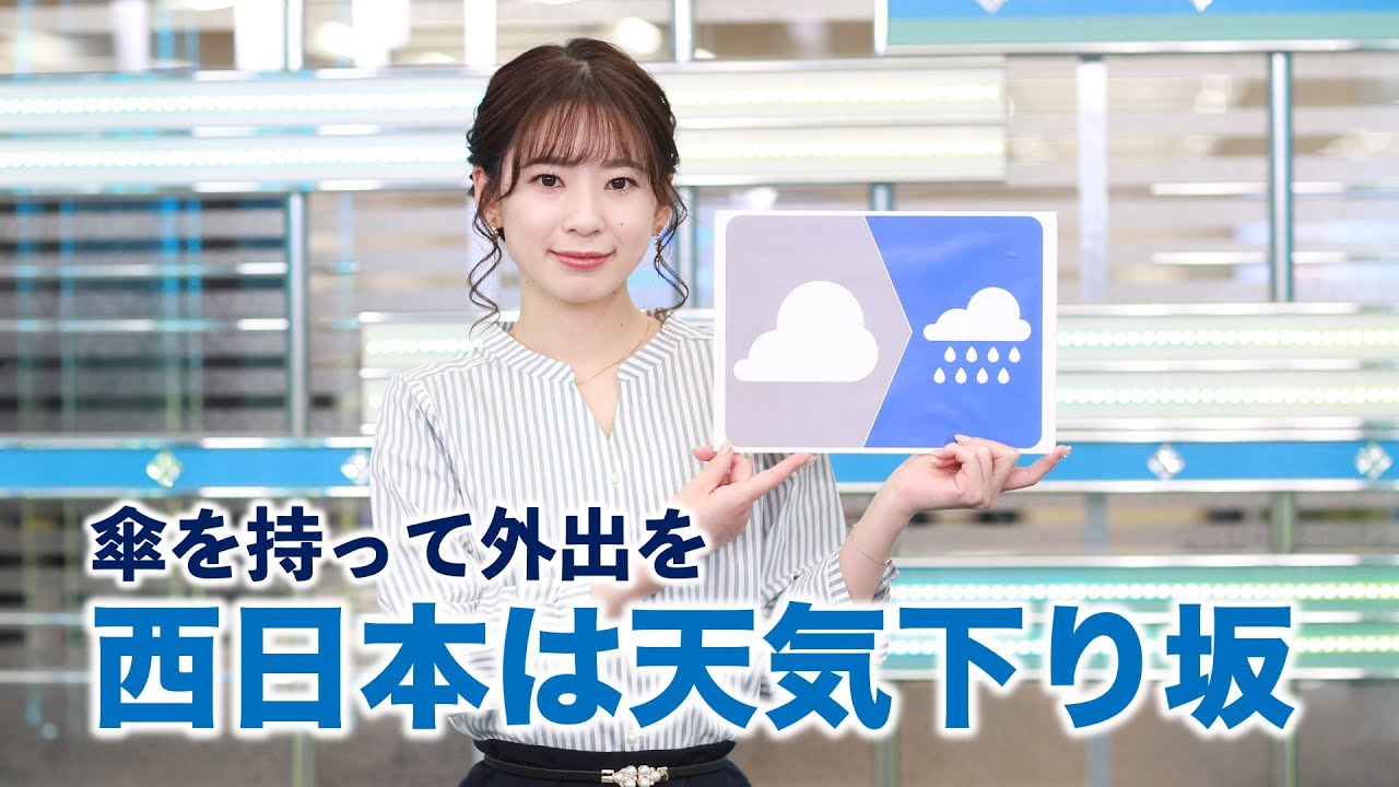一方西日本は、晴れていても天気は下り坂です。夕方から夜にかけては九州を中心に雨の範囲が広がります。遅い時間ほど雨具が必要になりそうです。