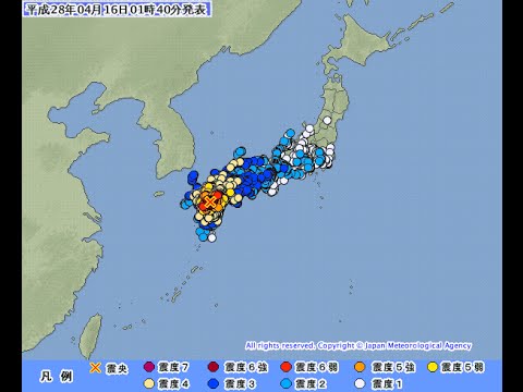 気象庁 地震速報(http://www.jma.go.jp/jp/quake/quake_local_index.html)より。 震源と震度の画像を、熊本周辺の地震のみを一週間分(2016/04/14 21:26~2016/04/21 18:43)つなげました。 一週間地震地震情報気象庁熊本熊本地震震度震源震源情報