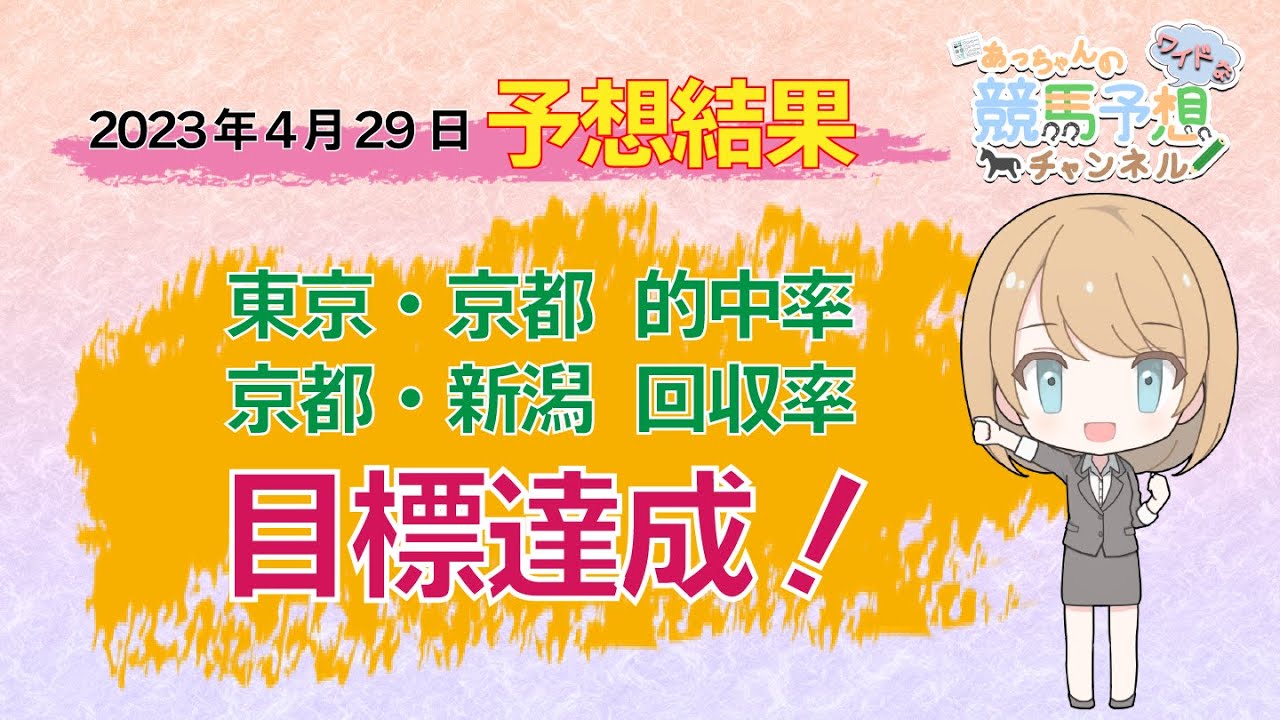 2023年4月29日に開催された、東京・京都・新潟競馬場全レースを予想した結果の的中率、回収率をお知らせしています。