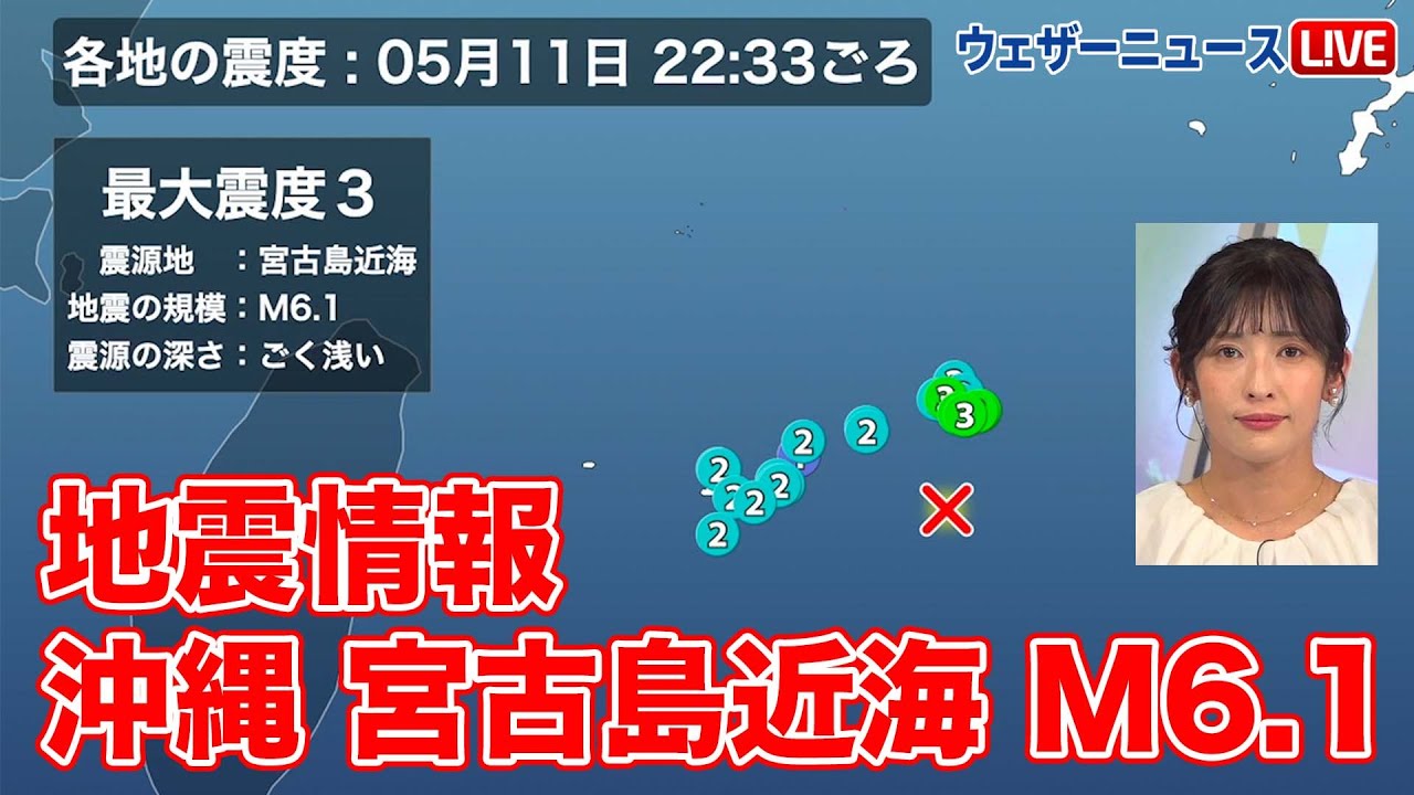 5月11日(木)22時33分頃、沖縄県で最大震度3を観測する地震がありました。