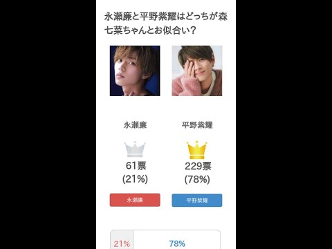 #永瀬廉 と #平野紫耀 はどっちが #森七菜ちゃんとお似合い?というテーマの投票結果です。