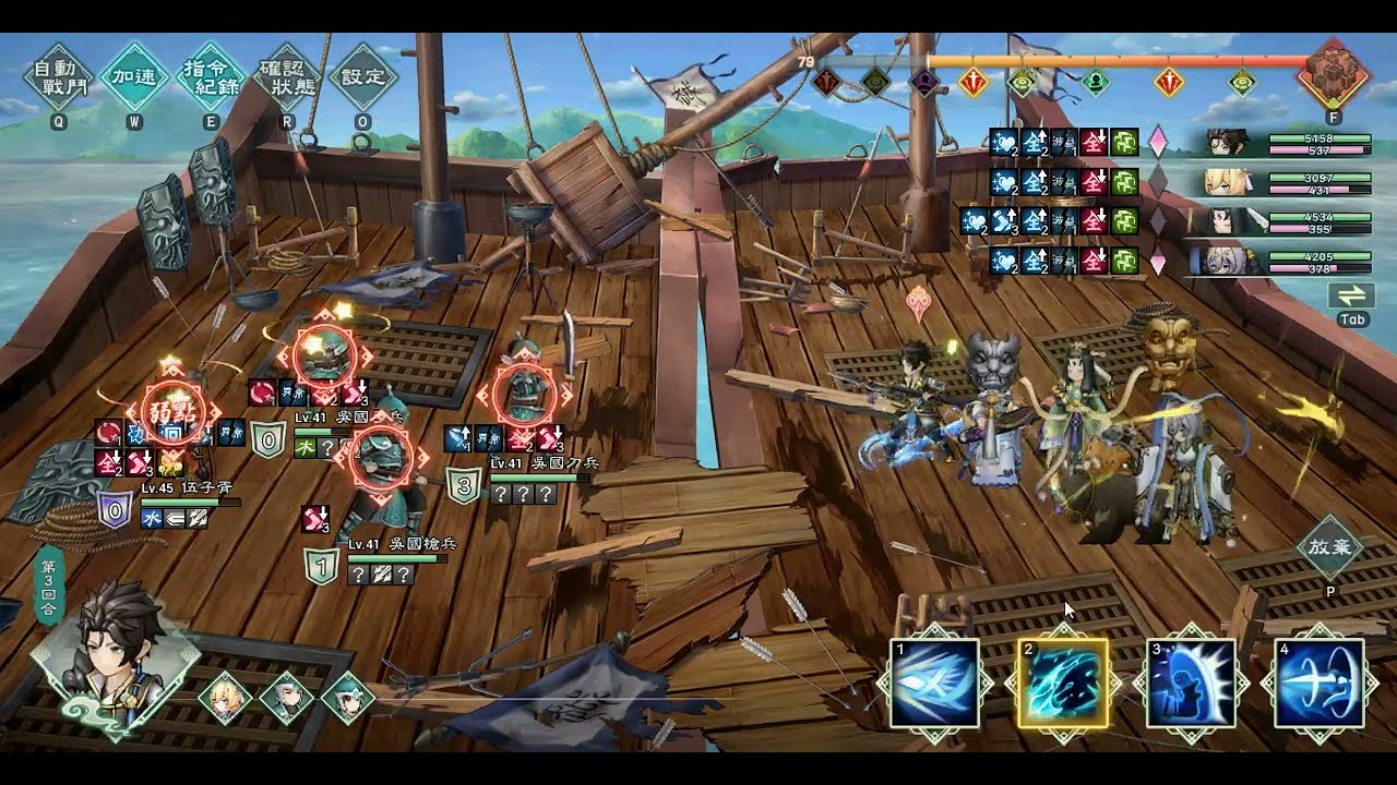 瑜兒(50) +後排 譙方(50) 選擇弱點攻擊法術(當初選他是為了猜弱點,不過只有吳國弓兵 才有木+奇的弱點。 所以也可以換別隻最少40級以上的角色)